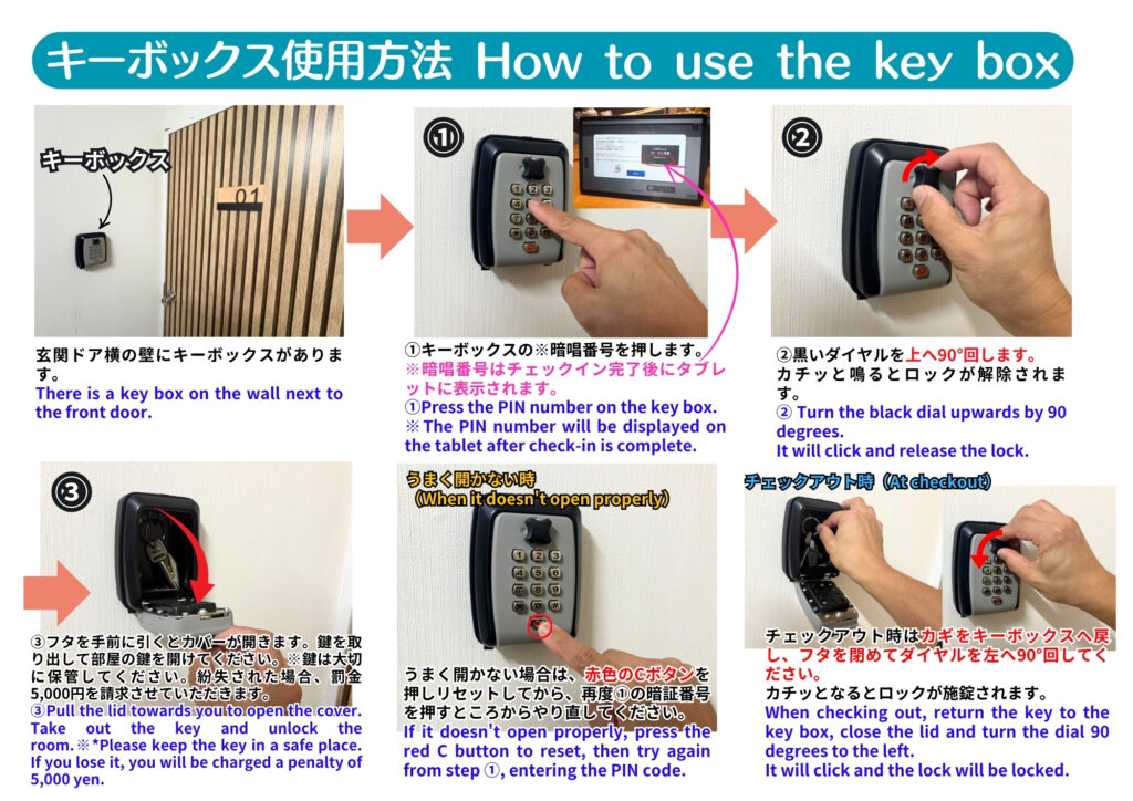 4.忘れ物が無いかご確認いただき、玄関を施錠してから鍵をキーボックスに戻してロックをかけてからお帰りください。