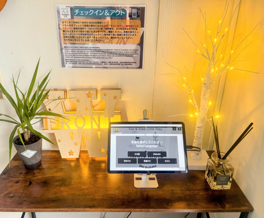 1.駐車場から階段を上って最初の棟(向かって右側の棟)の玄関を入ってすぐにフロント(受付)がありますので、タブレットでチェックイン操作(宿泊者情報の入力)を行ってください。