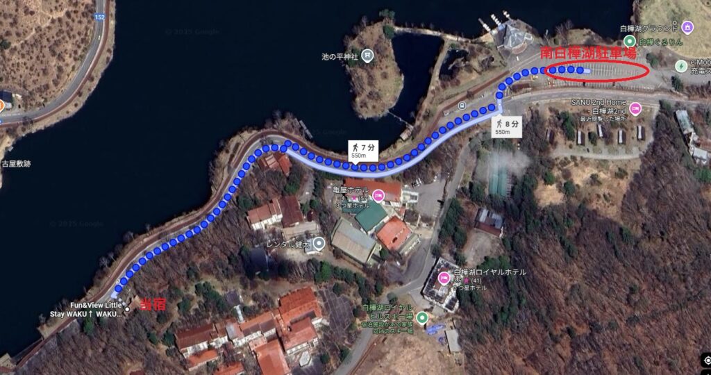 2台以上でのご利用の場合や、外国車などの大型車の場合は宿より、車で約1分、徒歩で約7分(距離約550m)ほどの場所に無料駐車場がありますのでそちらに駐車をお願いします。(下図参照)